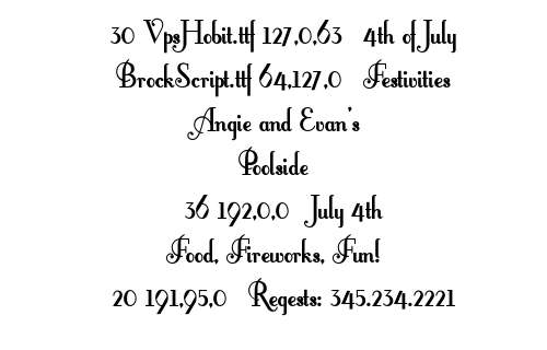 [30 DieDie.ttf 196,155,113]This is not a night [30 DieDie.ttf 196,155,113]to be alone! Join us for an evening of evil spirits and fiendish foods! [29 Splurge.ttf 255,0,0]Halloween High Jinks Friday, October 31st at the bewitching hour of 8 1302 Scott Way Dress in sinister fashion [29 Splurge.ttf 255,0,0]Mary and Tom
